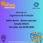 Estão abertas as inscrições para o Processo Seletivo de alunos especiais do curso de pós-graduação em Engenharia de Produção da FAENG. O processo é destinado a candidatos com diplomas de graduação que podem concorrer para cursar até 2 disciplinas no primeiro semestre de 2026. Confira abaixo o edital: Edital aluno especial 2026/1 As inscrições ficam […]