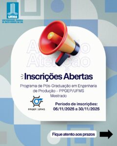 O PPGEP/UFMS informa que estarão abertas, a partir de 05/11/2025, as inscrições para o Mestrado Acadêmico em Engenharia de Produção da FAENG, com ingresso previsto para o primeiro semestre de 2026.